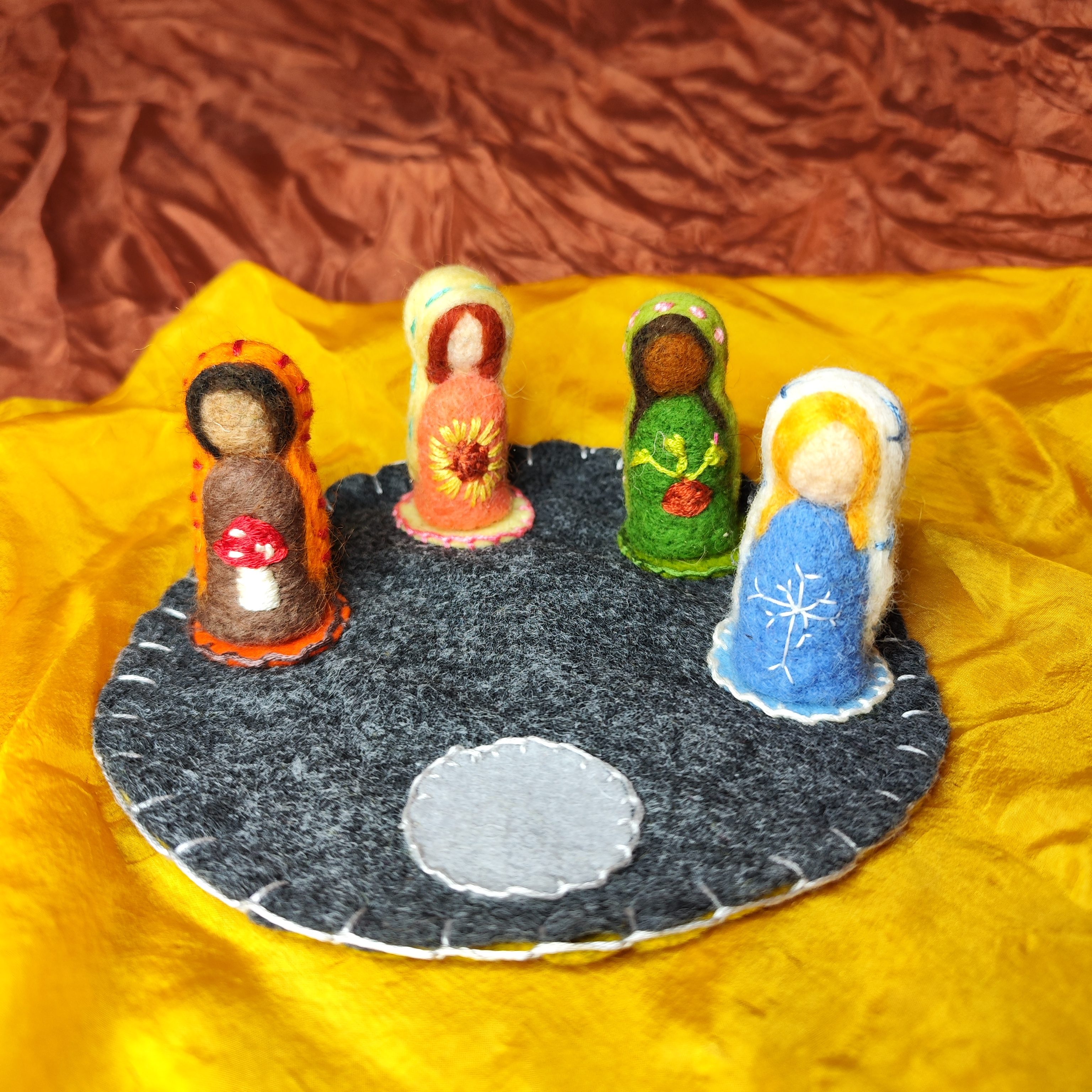 Materialien bietet uns die Natur mehr als genug. Blätter, Steine, Kastanien, Tannenzapfen und Blumen bereiten eine schöne Möglichkeit das was in der Natur passiert, im Haus zu spiegeln. In vielen Blogs und Instagram Posts gewinnt man schnell den Eindruck, dass ein gelungener Jahreszeitentisch vielleicht etwas ist, was teuer sein muss. Man klickt durch das Netz und sieht so abwechslungsreiche Jahreszeitentische mit teuren Dekorationen. Aber das Gegenteil ist der Fall. Nutze, was du in der Natur findest. Filzfiguren, wie ich sie herstelle, sind zwar nett, aber kein Muss. Und du kannst versuchen, diese Dinge selbst herzustellen. Das macht Freude und gibt allem einen persönlichen Touch. Finde, was dir gefällt.